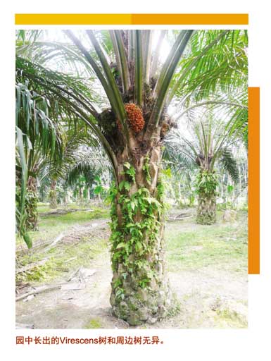 Virescens油棕即是属于非洲棕的一种,也因油棕培育计划广泛使用非洲及美洲油棕品种进行交配以培育兼具各种特质的油棕,如高油量、长高率低、枝叶较短、B胡罗卜素高、高碘等,这使到Virescens树时儿出现在园里,颇令人感到莫名其妙为何会跑出这种树来。但也无妨,反正果串续生棕油厂也接受,就由它继续生长吧!
