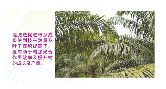 叶子面积及果串的提升:在 30cm 深的小洞埋肥,枝干 (编号17) 及叶子面积增加了。把肥埋在 90cm 深处的2年后,油棕性别比率增加了19%,而在 60cm 深埋肥下,却增加了70%进而使到果串数量分别地增加了2%及17%。1984年的鲜果串产量增加0.45 – 1.15吨/公顷/年,而1987年则增加了1.0 – 5.7吨/公顷/年,这番结果显示出埋肥法具有增加产量的效益。