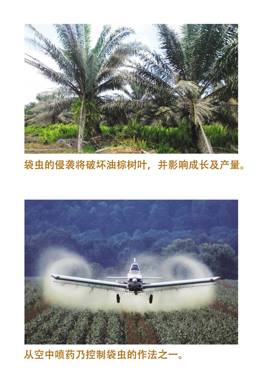食叶虫尤其袋虫是油棕的主要虫害之一。以杀虫剂向树叶喷洒乃常被采用的控制法。例如 cypermetherin 即是这类杀虫剂之一。一般上,喷洒方法多用于树龄6年以下的油棕而成龄的油棕就常使用渗透性杀虫剂如 monocrotophos 及 methamidophos 以注射入树茎来进行。然而,从地面或空中喷洒杀虫剂虽然可杀灭袋虫,但是也同时危害到一些有益昆虫如授粉昆虫及寄生蜂等等。况且,在山坡地,喷洒杀虫剂有时也难于有效地进行。另一方面,树茎注射法来控制袋虫亦有弱点,因为树茎被开洞以便注射杀虫剂可能致伤油棕,而且洞口易受到有害微生物感染。