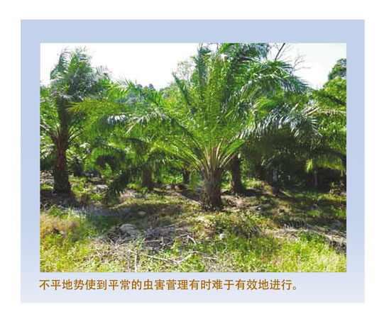 有鉴于此,新的一种作法就引应而生。这种作法是从树根下手将渗透性杀虫剂在切割的根尾以地引力原理导入树体里。其实这种方法曾在印尼被试验以探讨它控制数种尤其食虫害的效益,而在印度,它已广泛被用来控制椰树的黑头食叶虫及红棕榈象鼻虫。从正面角度来看,通过根传相信对油棕不带来伤害,因为此方法并不需要在树茎上钻洞。此外它适用于各年龄及山坡地的油棕。此方法的科学性效益其实已经通过实地试验而产生可供参考如下列。