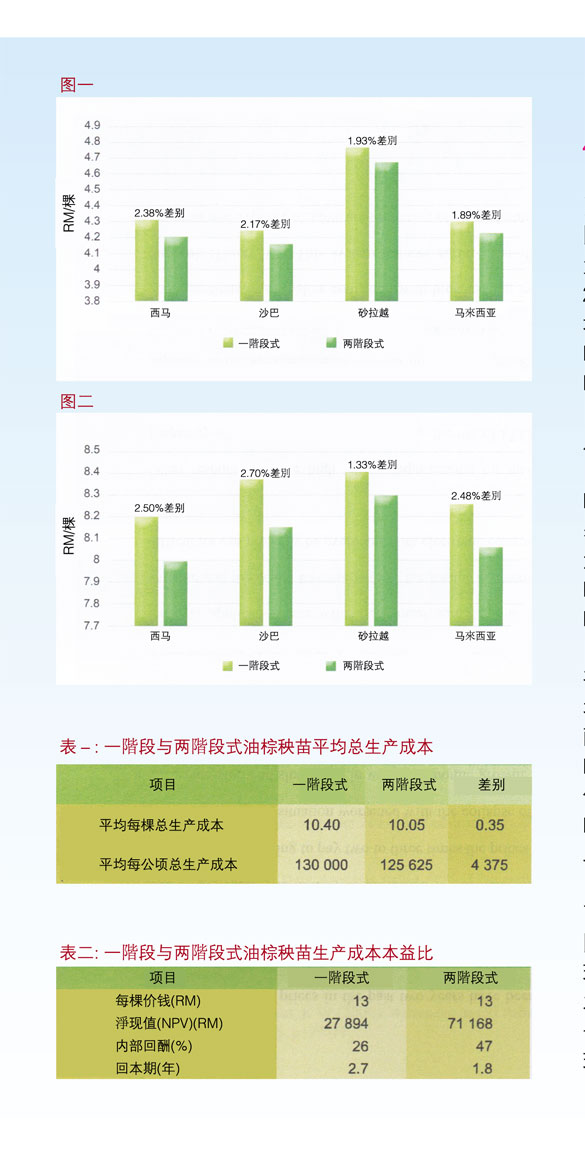 从表一,可看到每棵以两階段式培育出來的生产成本比一階段式高多RM0.35,那么一公顷就有RM4,375的差別了。从表一也可看出两階段式作法在一公顷地的生产成本为RM125,625,而一階段式则RM130,000,差别就是RM4,375了。