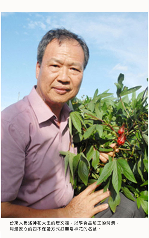 台东人称洛神花大王的唐文礼,以学食品加工的背景,用最安心的四不保证方式打响洛神花的名号。