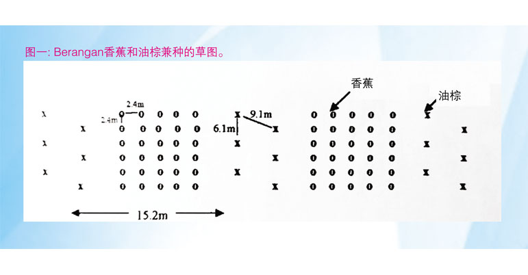 兼种可始于油棕下种前 (秧苗定位后) 或下种后。首先将要下种香蕉之15.2米的土地清理一番并犁松。香蕉种植距离则有视土地的清理情况而定。若老树以零梵燒 (生物质堆放在树之间) 处理,那么就能以2.4米 x 2.4米的距离下种5行 (见图一),每公顷可种下880棵。如果老树乃全部清理掉,那么就有更大的空间可以种下7行的香蕉,一公顷容纳1060棵。