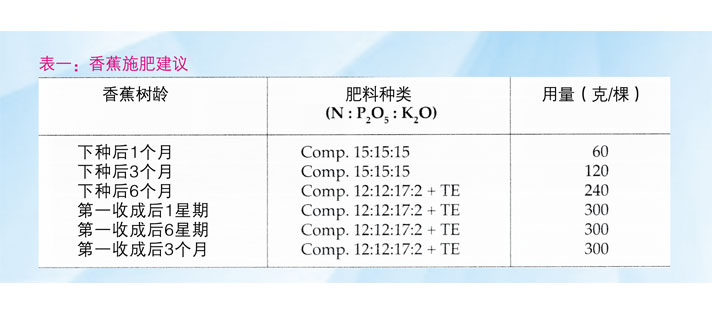 种植洞坑一般以0.45 x 0.45 x 0.45米为主并同時洒下200克的磷矿粉以促根。雨季來臨前乃最好的下种時间。施肥计划请见表一。香蕉施肥由于树体积不大所以相对简单,只需在成长期采用平衡复合肥如15/15/15及欲产果時以12/12/17/2 + TE來处理即可 (表一)。