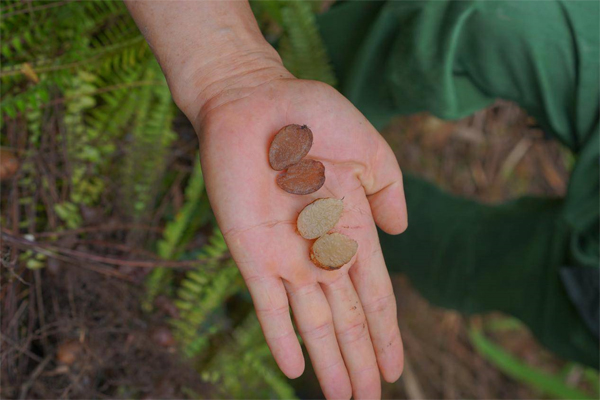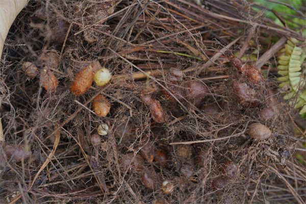 它的果实呈深棕色,挖出拿到河里清洗之后,果实就变得有点半透明了,把肾蕨果掰断之后,中间的果肉就是晶莹剔透的,像提子一样水灵,看起来就十分可口,但是肾蕨是远远不如提子可口的,它尝起来是有一点涩涩的味道到,一口咬下去会喝到很多汁液,可以当野外求生的一个应急水源。