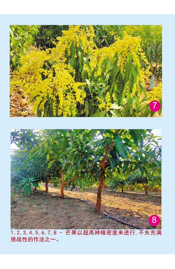 UHDP 有数个种法,皆在树距的分别罢了。树距也要看士质适合性及肥沃度而定。可采用的树距包括4 x 2m (500棵/亩,平坦及肥沃地,树种较大)、3 x 2m (674棵/亩,不肥沃微波地,树种较小)、4 x 3m (333棵/亩)。良好的土地可以最高密度下种,每亩674棵。若 Amrapali 品种芒果以2.5 x 2.5m三角形下种,每公顷可容纳1600棵,产量比传统低密度高了2.5倍。一些有间隔一年才生果刁性的品种则可采用植物成长抑制剂如多效唑来促花催果。