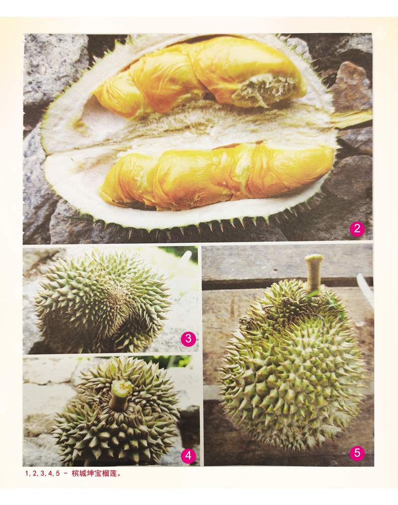 坤宝榴莲果形一般上不圆整,就如照片所示,而且有难剥开之势,常常导致剥开者的手指受伤。然儿一旦成功剥开,其诱人的果肉会使人忘记了剥之的辛苦过程,因为风味確与众不同。
