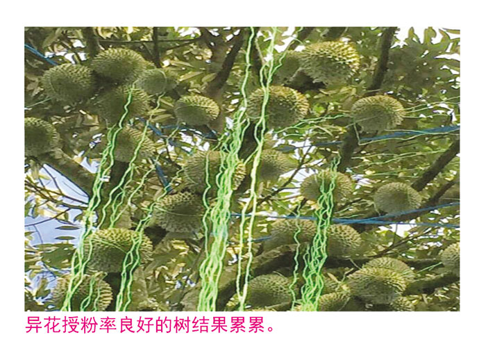在自花授粉方面,猫山王花朵就以猫山王的雄花粉以人手授粉。试验中也安排了猫山王开放式的自然授粉作为对照比较用途。当然在这环节,雄花也沒去除掉而雌花也沒被包起來,只是雄花未开展前暂时包起來以免发生不必要的事故。授粉作业是于2018年4月11日进行,每花串的坐果率分别于2、4、6、10及12个星期后记录下来并进行分析。试验也采用重复地段数据以加強精准度。
