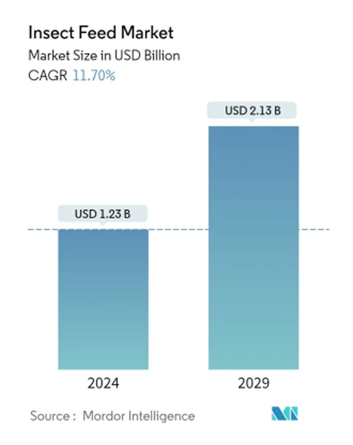 - 此外,世界各地对养殖鱼类的需求不断增加导致鱼粉和鱼油价格上涨。昆虫饲料是水产饲料中富含蛋白质的可行选择。过去 20 年来,人们对昆虫粉作为鱼粉的替代来源进行了研究。到目前为止,替代鱼粉喂养水产养殖品种的结果是有希望的。此外,作为可行的动物饲料,昆虫因其高能量和蛋白质含量而受到越来越多的认可。与新鲜或未加工的干燥昆虫相比,昆虫饲料的优点在于,它可以很容易地与其他饲料成分(例如磨碎的谷物和大豆)混合,形成所需成分的混合物,然后将其压制成颗粒,以便更好、更方便地使用。喂养动物。