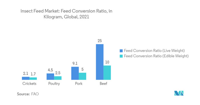 随着肉类需求的增加,对谷物和蛋白质饲料的需求可能会增加。例如,牲畜需要大约6公斤植物蛋白才能获得1公斤动物蛋白。饲料到肉类的转化率(体重增加 1 公斤所需的饲料量)根据动物类型和所采用的生产实践而有很大差异。通常,在美国生产系统中,1公斤活体动物重量需要相应的饲料量,即2.5公斤鸡肉、5公斤猪肉和10公斤牛肉,而昆虫需要的饲料要少得多。因此,与畜禽相比,昆虫的高饲料转化率和高营养价值可能会推动预测期内昆虫市场的增长。