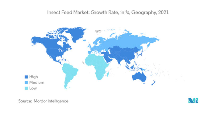 - 与传统动物饲料产品相比,昆虫饲料行业目前面临着商业规模生产等挑战。然而,由于全球范围内市场需求的不断增长,在研究期间注意到了一些主要因素,包括私人风险投资(VC)公司在昆虫饲料市场上的新投资。例如,2021年6月,智利风险投资公司KeyyakVenture向智利一家生产昆虫饲料的初创企业Food for the Future (F4F)投资了450万美元。因此,这些风险投资公司不断增长的投资表明了他们对扩大这个市场的信念。与此同时,昆虫的高饲料转化率、低空间要求、支持性监管法规等正在推动昆虫饲料市场的发展。