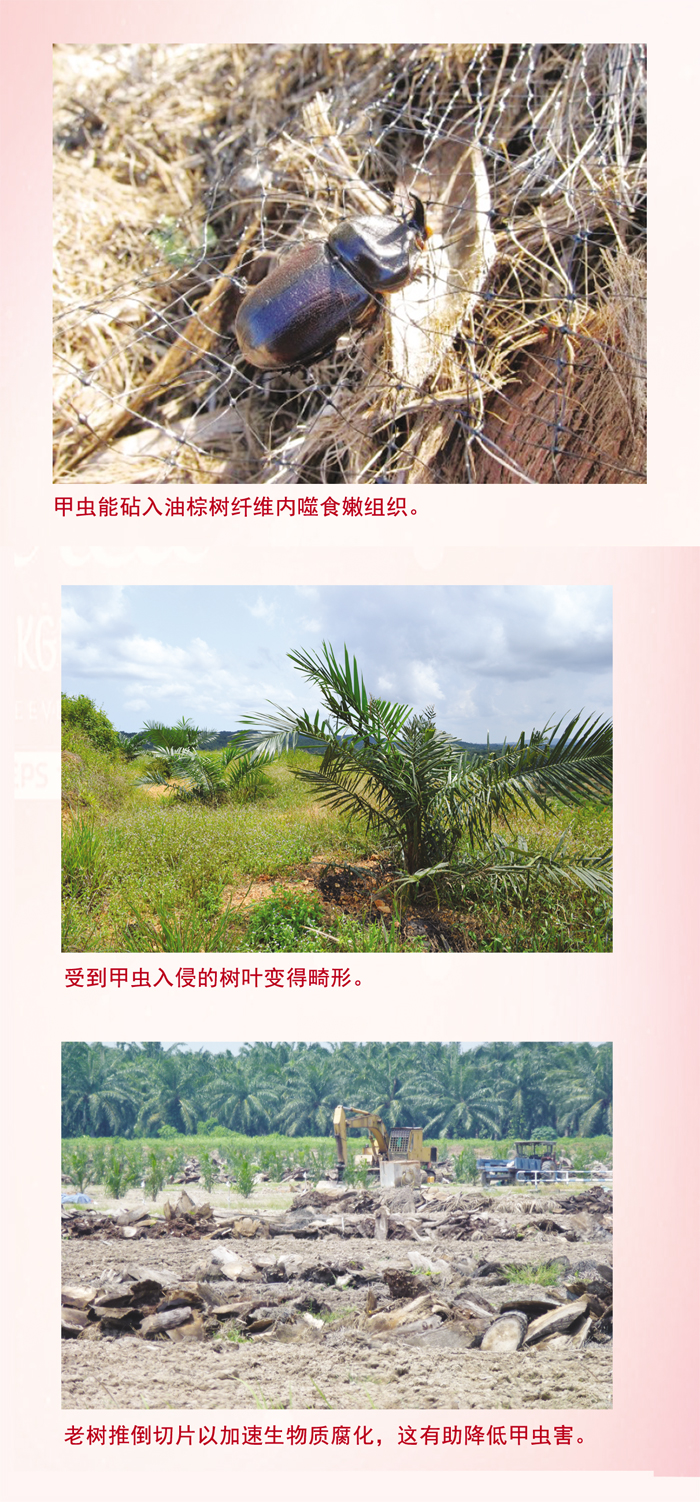 ● 成龄油棕也窝藏甲虫,例如残余生物质中,因此对这些地点加以管控有助降低虫害率。大型园丘翻种应以两年交错期为佳从而介入甲虫生长周期期及减少外來甲虫进入翻种地繁殖。