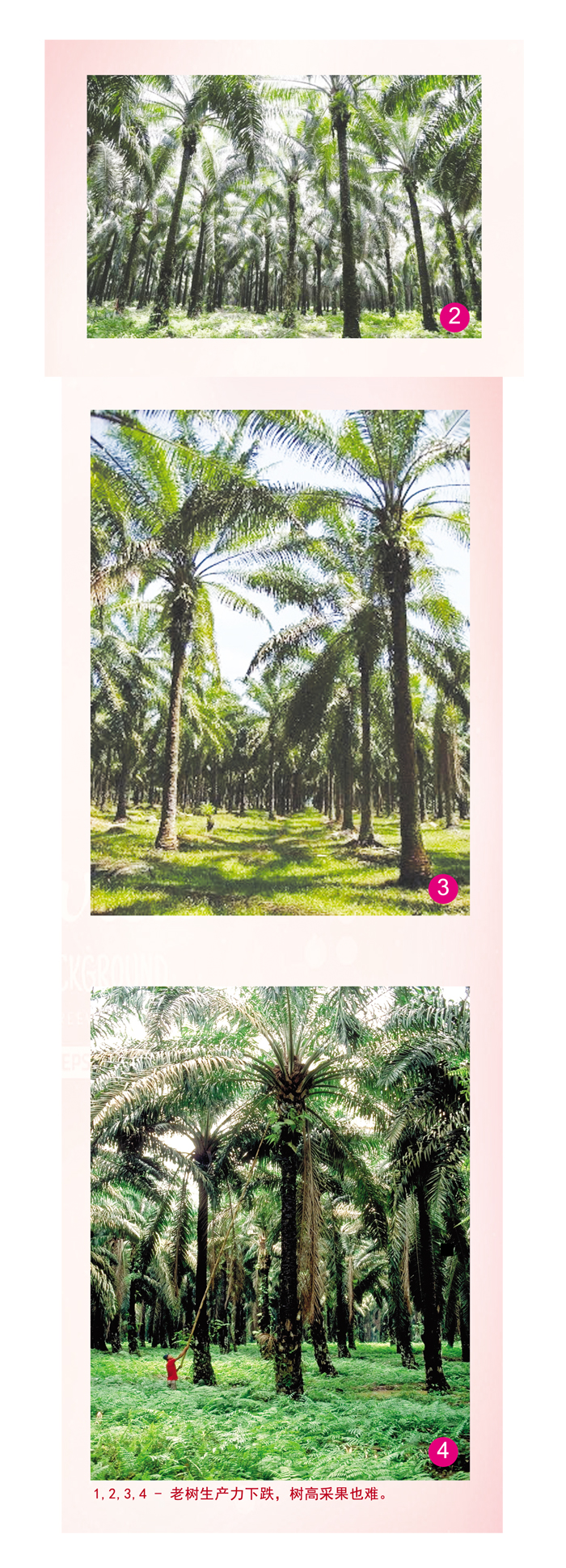 他解释,超过19年的油棕多数已长得太高,采果也艰难。采高树果要有一定的技巧,就目前情况来说,大马根本就缺乏这类熟练的采果工人来进行这项作业。再说到了这年龄的园丘,每公顷原本有136 – 148棵的油棕,许多已剩下不及100棵/公顷而使到产量不符合经济效益。