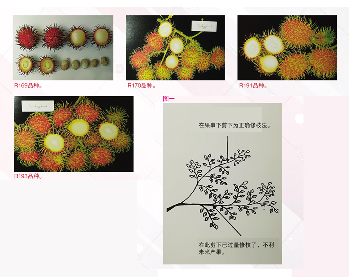 一点值得注意的是这两种作物皆在树枝尾端长果,和芒果一样,如此一來,那么每次的开花结果期就有赖于每年的新枝萌长期。若只依靠树本身自然地长出新枝,那可要等待较长的时间,因此业者在收成过后以人工修枝可加速新枝更快萌出。然儿修枝必须得法才能帶來效益,倘若作错将弄巧成拙造成下轮次的低产甚至零产。因此收果期或收果了之后,修枝必须适可而止 (见图一) 以避免树体产生过度压迫感而休产。其实红毛丹与葡萄桑的采摘一般皆以整串采下进行,此举也就相等于适当的修枝了,再顺便将干枯、不生产且患病枝条采下即一次过完成修作业了。