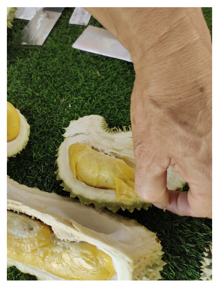 与两年前相比,今年的坤玉王在口感上更显黏口、扎实,风味层次更加集中,给人一种丰盛而厚实的满足感。陈园主也在场示范促进果肉完美发酵的方法。他说, 刚掉下的榴莲, 发酵度一般仅90%, 他剝开后让它露在空气中大约10分钟, 鲜黃的果肉逐渐转色成亮黃, 说明果肉已完全发酵, 正是品尝的最佳時刻。